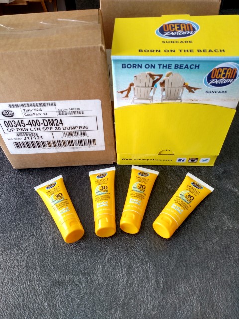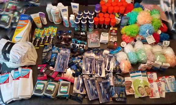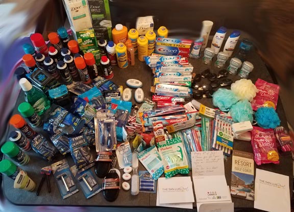Dove bar soaps, individual sun screens, playing cards, cotton swabs and balls kits,