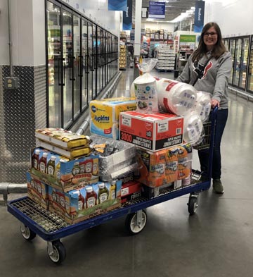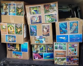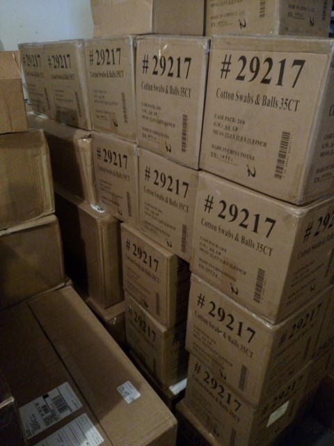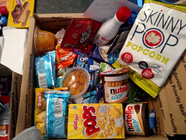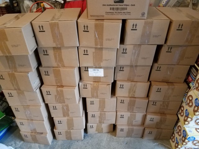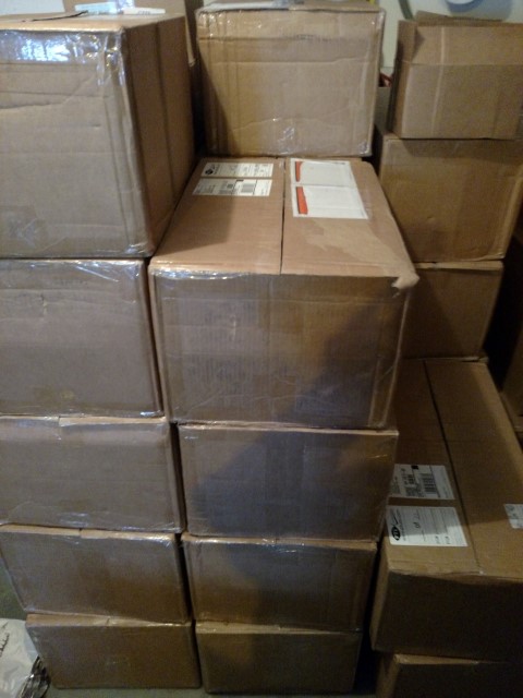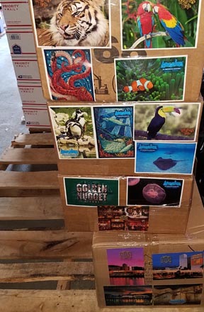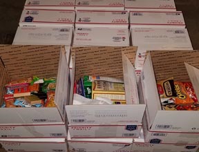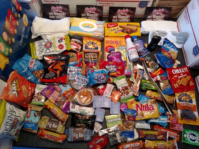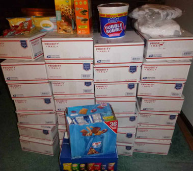 Hand picked items in large flat rate boxes as well as shrink wrapped bundles of post cards for troops to send messages home.