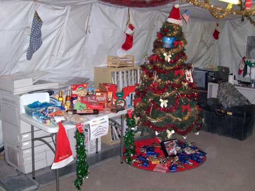 Christmas in Kuwait - Treats we sent are on the table and they used a picture I took of our icestorm as an ornament